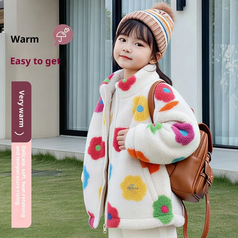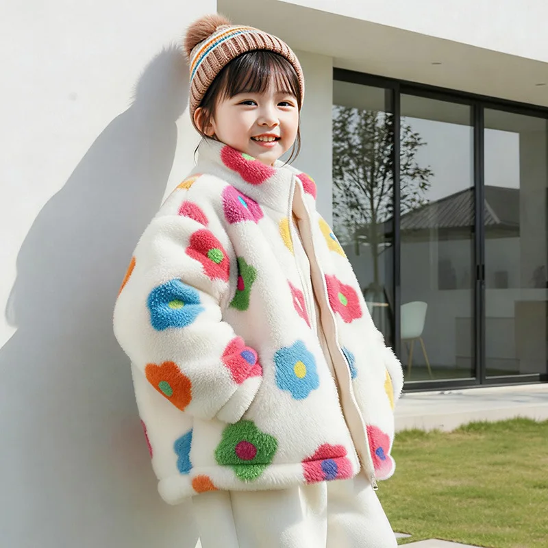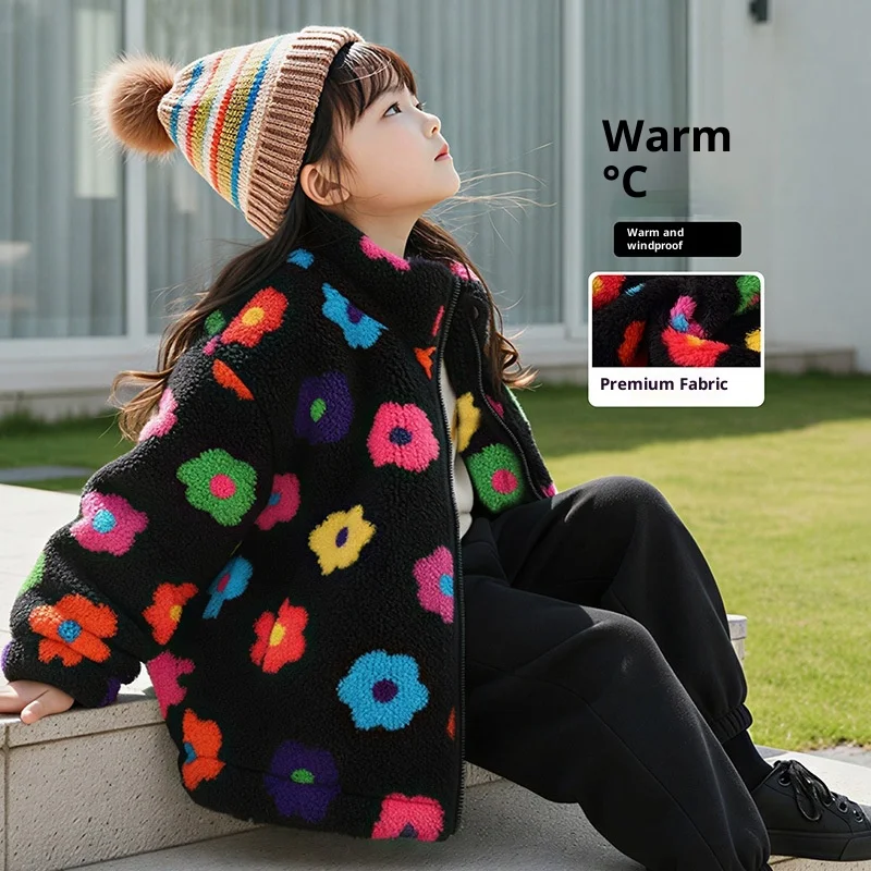 Customizable Girls Fleece Jacket Vivid Flower Pattern Trendy Chain Detail Casual Winter Coat Clothes for Kids